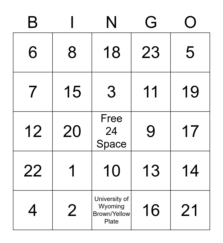 This bingo card has a free space and 24 words: 1, 2, 3, 4, 5, 6, 7, 8, 9, 10, 11, 12, 13, 14, 15, 16, 17, 18, 19, 20, 21, 22, 23 and University of Wyoming Brown/Yellow Plate.