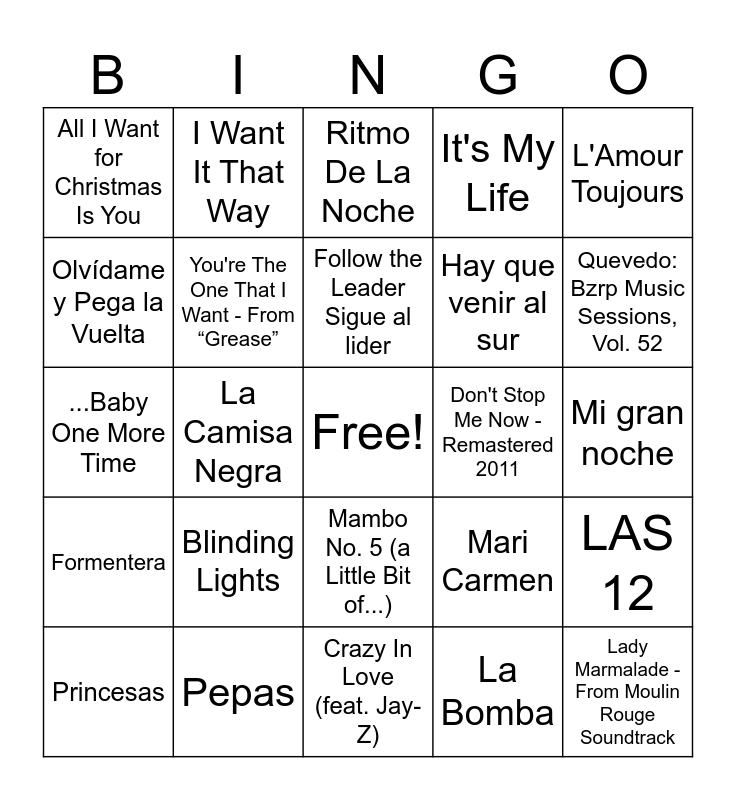 This bingo card has a free space and 75 words: Flying Free, Saturday Night - Radio Mix, Ritmo De La Noche, Cuando zarpa el amor, Yo Quiero Bailar, Ave María, Que La Detengan, Torero, Sarandonga, Por la Raja de Tu Falda, Gasolina, Livin' la Vida Loca, Follow the Leader Sigue al lider, Olvídame y Pega la Vuelta, La Gozadera (feat. Marc Anthony), La Camisa Negra, Viva La Vida, Lady Marmalade - From Moulin Rouge Soundtrack, Whenever, Wherever, L'Amour Toujours, Billie Jean, ...Baby One More Time, You're The One That I Want - From “Grease”, I Want It That Way, It's My Life, Dancing Queen, Blame It on the Boogie, I Wanna Dance with Somebody (Who Loves Me), DESPECHÁ, Monotonía, Milionària, Todos los días sale el sol, La Revolución Sexual, Mari Carmen, Quevedo: Bzrp Music Sessions, Vol. 52, Hay que venir al sur, Me Colé en una Fiesta, A quién le importa, Mi gran noche, La Bomba, Fiesta Pagana, The Ketchup Song (Aserejé) - Spanish Version, The Final Countdown, Para No Verte Más, Bonito, Vivir Mi Vida, Princesas, All I Want for Christmas Is You, Believe, Suavemente, Total Eclipse of the Heart, Mambo No. 5 (a Little Bit of...), Macarena - River Re-Mix 103 BPM, Solo Se Vive una Vez, Amigos para Siempre, Salta!!!, Ay Mamá, YMCA, Gimme! Gimme! Gimme! (A Man After Midnight), Girls Just Want to Have Fun, Blinding Lights, I Gotta Feeling, Poker Face, I Will Survive, Walking On Sunshine, Don't Stop Me Now - Remastered 2011, Stayin Alive, Tacones Rojos, La chica yeyé, LAS 12, Formentera, Pepas, It's Raining Men, Crazy In Love (feat. Jay-Z) and Wannabe.