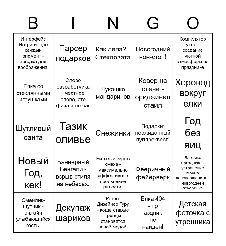 This bingo card has 32 words: Ёлка 404 - праздник не найден!, Новогодний фильтр: все весело, ничего серьезного!, Тазик оливье, Ёлки-матрёлки!, Новый Год, кек!, Слово разработчика - честное слово, это фича а не баг, Компилятор уюта - создание уютной атмосферы на празднике, Багфикс праздника - устранение любых несовершенств в новогодней вечеринке, Парсер подарков, Детская фоточка с утренника, Лукошко мандаринов, Как дела? - Стекловата, Асинхронный смех - празднование в несинхронном режиме., Праздничный роллбек!, Подарки: неожиданный пуллреквест!, Санта-тролль - рассмеши всех подарками., Смайлик-шутник - онлайн улыбающийся гость., Шутливый санта, Битовый взрыв смеха - максимально эффективное проявление радости., Баннерный Бенгали - взрыв стиля на небесах., Фееричный фейерверк, Загадать желание, Год без яиц, Декупаж шариков, Снежинки, Новогодний нон-стоп!, Ковер на стене - ориджинал стайл, Елка со стеклянными игрушками, Интерфейс Интриги - где каждый элемент - загадка для воображения., Ретро-Дизайнер Гуру - когда старые тренды становятся новой модой., Подарок с конфетами and Хоровод вокруг елки.