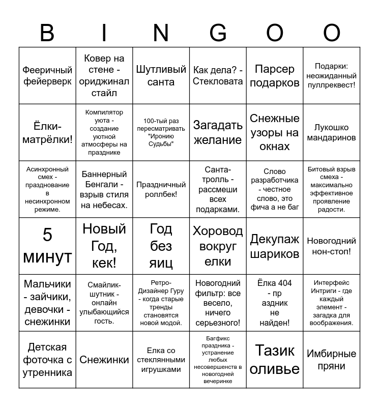 This bingo card has 37 words: Ёлка 404 - праздник не найден!, Новогодний фильтр: все весело, ничего серьезного!, Тазик оливье, Ёлки-матрёлки!, Новый Год, кек!, Слово разработчика - честное слово, это фича а не баг, Компилятор уюта - создание уютной атмосферы на празднике, Багфикс праздника - устранение любых несовершенств в новогодней вечеринке, Парсер подарков, Детская фоточка с утренника, Лукошко мандаринов, Как дела? - Стекловата, Асинхронный смех - празднование в несинхронном режиме., Праздничный роллбек!, Подарки: неожиданный пуллреквест!, Санта-тролль - рассмеши всех подарками., Смайлик-шутник - онлайн улыбающийся гость., Шутливый санта, Битовый взрыв смеха - максимально эффективное проявление радости., Баннерный Бенгали - взрыв стиля на небесах., Фееричный фейерверк, Загадать желание, Год без яиц, Декупаж шариков, Снежинки, Новогодний нон-стоп!, Ковер на стене - ориджинал стайл, Елка со стеклянными игрушками, Интерфейс Интриги - где каждый элемент - загадка для воображения., Ретро-Дизайнер Гуру - когда старые тренды становятся новой модой., Подарок с конфетами, Хоровод вокруг елки, Снежные узоры на окнах, Мальчики - зайчики, девочки - снежинки, 5 минут, 100-тый раз пересматривать "Иронию Судьбы" and Имбирные пряни.