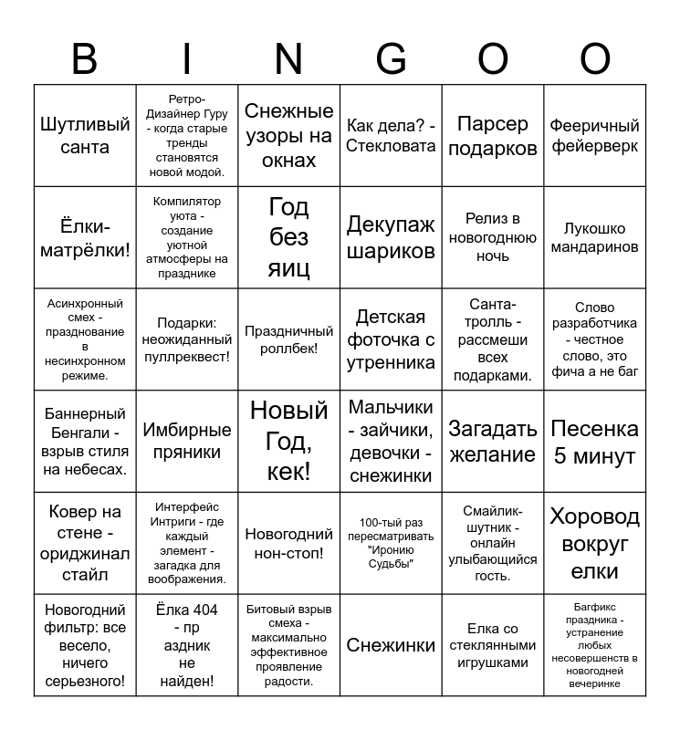 This bingo card has 39 words: Ёлка 404 - праздник не найден!, Новогодний фильтр: все весело, ничего серьезного!, Тазик оливье, Ёлки-матрёлки!, Новый Год, кек!, Слово разработчика - честное слово, это фича а не баг, Компилятор уюта - создание уютной атмосферы на празднике, Багфикс праздника - устранение любых несовершенств в новогодней вечеринке, Парсер подарков, Детская фоточка с утренника, Лукошко мандаринов, Как дела? - Стекловата, Асинхронный смех - празднование в несинхронном режиме., Праздничный роллбек!, Подарки: неожиданный пуллреквест!, Санта-тролль - рассмеши всех подарками., Смайлик-шутник - онлайн улыбающийся гость., Шутливый санта, Битовый взрыв смеха - максимально эффективное проявление радости., Баннерный Бенгали - взрыв стиля на небесах., Фееричный фейерверк, Загадать желание, Год без яиц, Декупаж шариков, Снежинки, Новогодний нон-стоп!, Ковер на стене - ориджинал стайл, Елка со стеклянными игрушками, Интерфейс Интриги - где каждый элемент - загадка для воображения., Ретро-Дизайнер Гуру - когда старые тренды становятся новой модой., Подарок с конфетами, Хоровод вокруг елки, Снежные узоры на окнах, Мальчики - зайчики, девочки - снежинки, Песенка 5 минут, 100-тый раз пересматривать "Иронию Судьбы", Имбирные пряники, Релиз в новогоднюю ночь and КУРАнты.