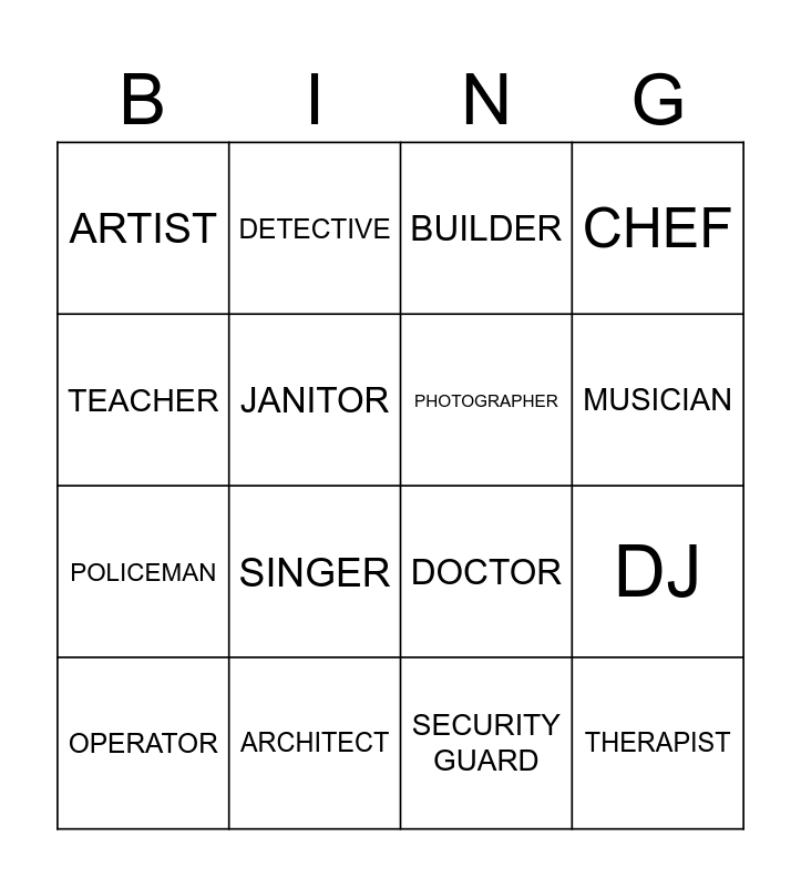 This bingo card has 41 words: Free!, DOCTOR, DENTIST, PHOTOGRAPHER, BARBER, SOCCER PLAYER, MUSICIAN, PHYSICIAN, TEACHER, THERAPIST, DJ, CHEF, OPERATOR, SECURITY GUARD, ARCHITECT, BUS DRIVER, LAWYER, ARTIST, DESIGNER, BUILDER, COACH, SCHOOL PRINCIPAL, PILOT, POLICEMAN, BARBER, ENGINEER, JOURNALIST, POLITICIAN, SINGER, NURSE, ORTHODONTIST, DETECTIVE, TECHNICIAN, PLUMBER, FARMER, JANITOR, HOUSEKEEPER, BABYSITTER, RECEPTIONIST, WAITER and BARTENDER.