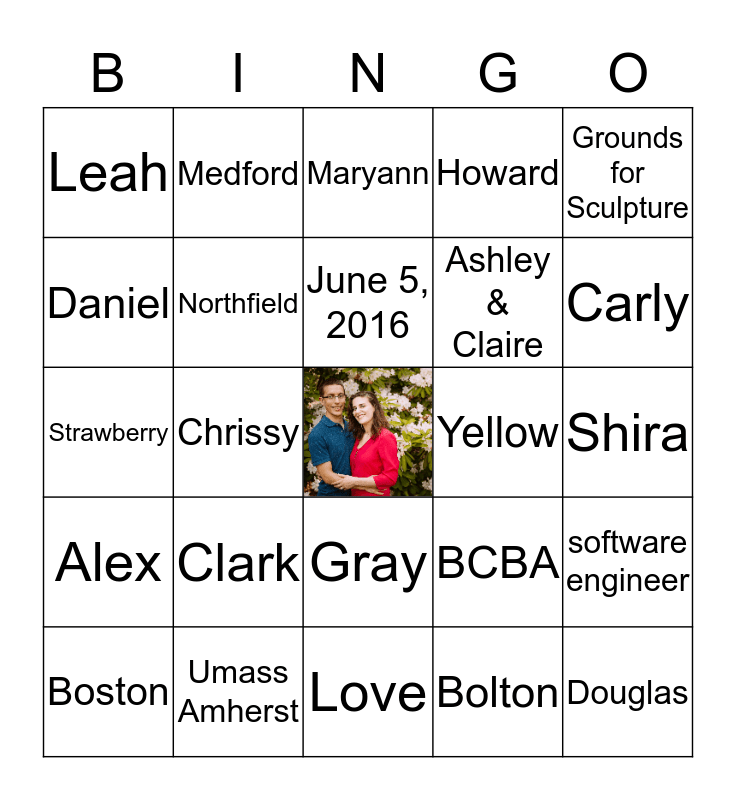 This bingo card has a free space and 24 words: Clark, Umass Amherst, June 5, 2016, Boston, Grounds for Sculpture, Leah, Daniel, Medford, Yellow, Gray, Ashley & Claire, Strawberry, BCBA, software engineer, Northfield, Bolton, Shira, Maryann, Carly, Chrissy, Douglas, Alex, Howard and Love.