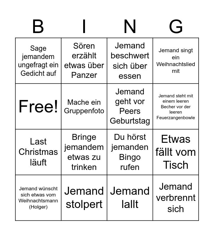 This bingo card has 16 words: Jemand stolpert, Etwas fällt vom Tisch, Jemand beschwert sich über essen, Sage jemandem ungefragt ein Gedicht auf, Last Christmas läuft, Sören erzählt etwas über Panzer, Du hörst jemanden Bingo rufen, Jemand lallt, Free!, Mache ein Gruppenfoto, Jemand wünscht sich etwas vom Weihnachtsmann (Holger), Jemand singt ein Weihnachtslied mit, Bringe jemandem etwas zu trinken, Jemand steht mit einem leeren Becher vor der leeren Feuerzangenbowle, Jemand geht vor Peers Geburtstag and Jemand verbrennt sich.