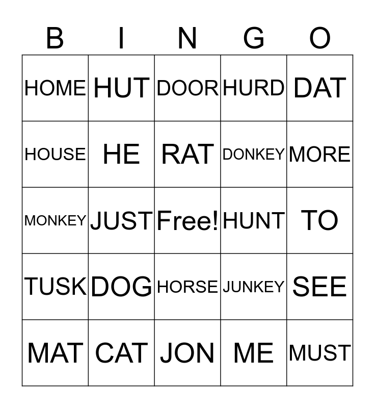 This bingo card has a free space and 24 words: DOG, CAT, RAT, MAT, DAT, HOME, HOUSE, HUT, HUNT, HORSE, DONKEY, MONKEY, JUNKEY, SEE, HE, ME, TO, DOOR, MORE, JUST, MUST, TUSK, HURD and JON.