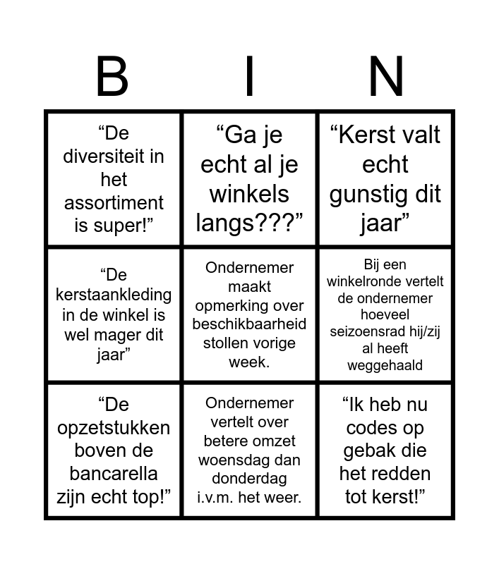 This bingo card has a free space and 8 words: Bij een winkelronde vertelt de ondernemer hoeveel seizoensrad hij/zij al heeft weggehaald, “Kerst valt echt gunstig dit jaar”, “Ga je echt al je winkels langs???”, “De opzetstukken boven de bancarella zijn echt top!”, “De diversiteit in het assortiment is super!”, “Ik heb nu codes op gebak die het redden tot kerst!”, “De kerstaankleding in de winkel is wel mager dit jaar” and Ondernemer vertelt over betere omzet woensdag dan donderdag i.v.m. het weer..