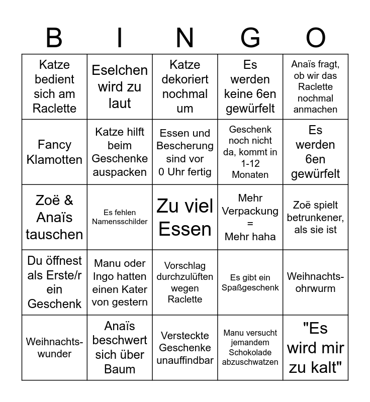 This bingo card has 30 words: Anaïs beschwert sich über Baum, Das Glöckchen klingelt während Ingo auf Klo ist, Es fehlen Namensschilder, Ingo macht einen (Vater-) "Witz", Katze bedient sich am Raclette, Katze dekoriert nochmal um, Katze hilft beim Geschenke auspacken, Vorschlag durchzulüften wegen Raclette, Mehr Verpackung = Mehr haha, Versteckte Geschenke unauffindbar, Zoë spielt betrunkener, als sie ist, Zu viel Essen, Manu versucht jemandem Schokolade abzuschwatzen, "Es wird mir zu kalt", Es werden 6en gewürfelt, Pechsträhne (es werden 6 Geschenke geöffnet, bevor du eins öffnest), Es gibt ein Spaßgeschenk, Du öffnest als Erste/r ein Geschenk, Manu oder Ingo hatten einen Kater von gestern, Anaïs fragt, ob wir das Raclette nochmal anmachen, Zoë & Anaïs tauschen, "Oh wow, damit habe ich ja gar nicht gerechnet", Eselchen wird zu laut, Geschenk noch nicht da, kommt in 1-12 Monaten, Fancy Klamotten, Es werden keine 6en gewürfelt, Weihnachts-ohrwurm, Weihnachts-wunder, Essen und Bescherung sind vor 0 Uhr fertig and Etwas Selbst-gemachtes.