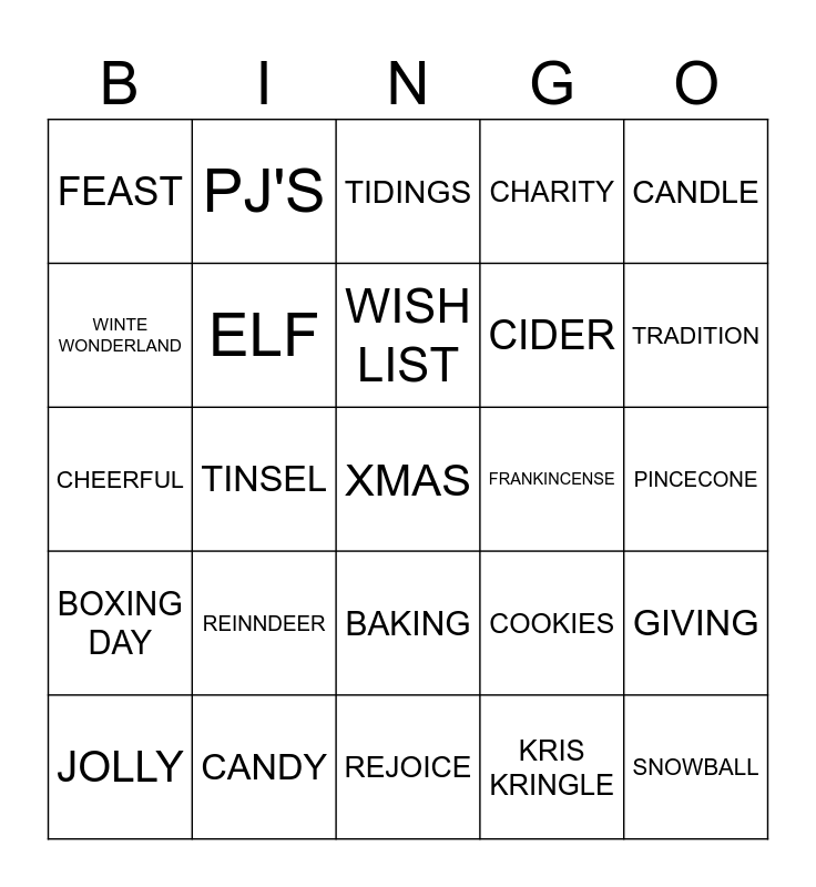 This bingo card has a free space and 29 words: JOLLY, FRUITCAKE, TINSEL, PLUMPUDDING, FEAST, TIDINGS, ELF, REINNDEER, FRANKINCENSE, CANDY, PINCECONE, SNOWBALL, REJOICE, KRIS KRINGLE, TRADITION, ADVENT, BAKING, BOXING DAY, CANDLE, CHEERFUL, COOKIES, CUPID, CIDER, WINTE WONDERLAND, CHARITY, PJ'S, GIVING, WISH LIST and CHEER.