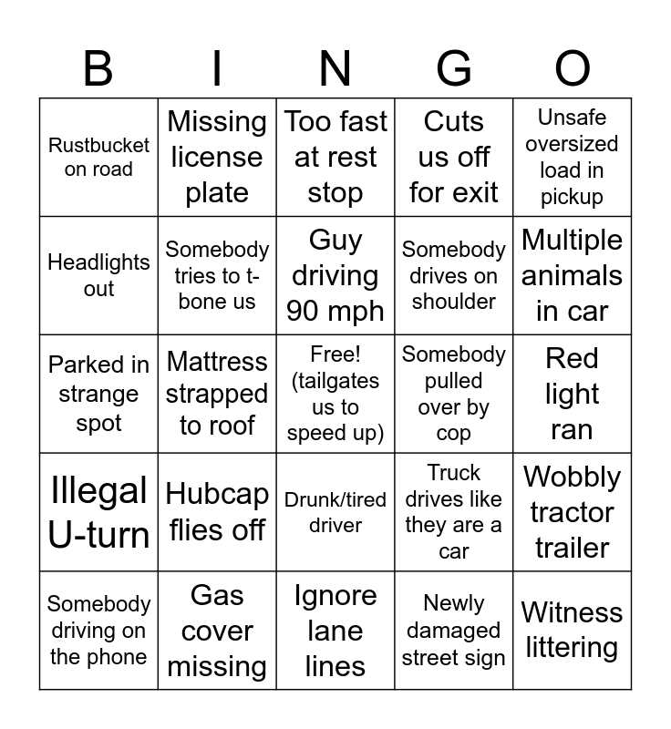 This bingo card has a free space and 24 words: Hubcap flies off, Gas cover missing, Guy driving 90 mph, Somebody driving on the phone, Unsafe oversized load in pickup, Rustbucket on road, Headlights out, Missing license plate, Somebody pulled over by cop, Drunk/tired driver, Somebody drives on shoulder, Parked in strange spot, Truck drives like they are a car, Wobbly tractor trailer, Somebody tries to t-bone us, Newly damaged street sign, Red light ran, Too fast at rest stop, Multiple animals in car, Mattress strapped to roof, Witness littering, Illegal U-turn, Cuts us off for exit and Ignore lane lines.