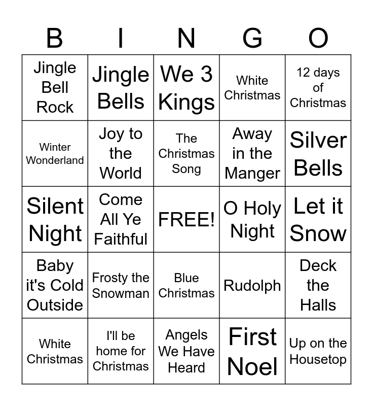 This bingo card has a free space and 24 words: Frosty the Snowman, I'll be home for Christmas, The Christmas Song, White Christmas, 12 days of Christmas, Jingle Bell Rock, Winter Wonderland, Jingle Bells, O Holy Night, Blue Christmas, Away in the Manger, Silent Night, Rudolph, Deck the Halls, Joy to the World, First Noel, Let it Snow, We 3 Kings, Silver Bells, Come All Ye Faithful, Up on the Housetop, Baby it's Cold Outside, White Christmas and Angels We Have Heard.