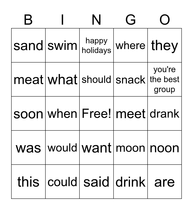 This bingo card has a free space and 24 words: would, could, should, this, they, sand, meat, swim, meet, want, snack, soon, moon, noon, what, drink, drank, happy holidays, you're the best group, when, are, was, where and said.