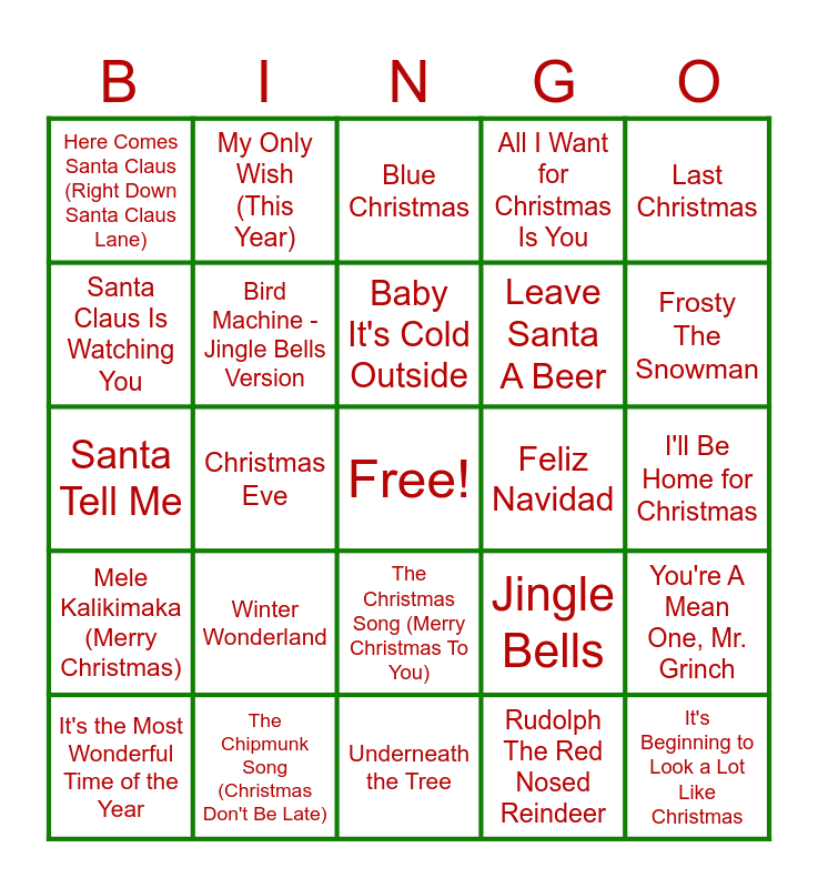 This bingo card has a free space and 45 words: Rockin' Around The Christmas Tree, It's Beginning to Look a Lot Like Christmas, Jingle Bell Rock, It's the Most Wonderful Time of the Year, A Holly Jolly Christmas, Rudolph The Red Nosed Reindeer, Blue Christmas, Run Rudolph Run, Last Christmas, The Chipmunk Song (Christmas Don't Be Late), All I Want for Christmas Is You, Feliz Navidad, The Christmas Song (Merry Christmas To You), Winter Wonderland, Let It Snow! Let It Snow! Let It Snow!, Underneath the Tree, Merry Christmas, Happy Holidays, Santa Tell Me, Santa Claus Is Coming To Town, Frosty The Snowman, My Only Wish (This Year), Little Saint Nick, Please Come Home for Christmas, Here Comes Santa Claus (Right Down Santa Claus Lane), Have Yourself A Merry Little Christmas, I'll Be Home for Christmas, Sleigh Ride, Deck The Halls, Jingle Bells, Mele Kalikimaka (Merry Christmas), I Saw Mommy Kissing Santa Claus, You're A Mean One, Mr. Grinch, O Holy Night, White Christmas, Silent Night, Christmas Eve, Grandma Got Run Over by a Reindeer, Christmas (Baby Please Come Home), Christmas in Hollis, Baby It's Cold Outside, Santa Claus Is Watching You, Leave Santa A Beer, Frosty Bounce, Bird Machine - Jingle Bells Version and Somewhere In My Memory (Home Alone Theme).