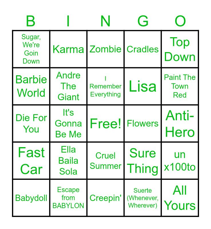 This bingo card has a free space and 44 words: Bottoms Up, All Yours, Shimmy Shimmy Ya, Babydoll, Moving, Suerte (Whenever, Wherever), Zombie, Focus, Hiccup!, Top Down, Escape from BABYLON, Cradles, Flowers, Cruel Summer, Ella Baila Sola, Last Night, Creepin', Snooze, Die For You, Calm Down, Paint The Town Red, Karma, Kill Bill, I Wanna Be Yours, Sugar, We're Goin Down, The Middle, Anti-Hero, Superhero (Heroes & Villains), As It Was, Sure Thing, Fast Car, vampire, un x100to, Search & Rescue, Stick Season, It's Gonna Be Me, SMiLE, Going Down, Dance The Night, I Remember Everything, Barbie World, Lisa, ALL GAS, Andre The Giant and Collard Greens.