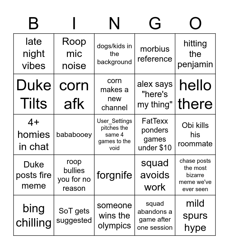 This bingo card has a free space and 24 words: roop bullies you for no reason, SoT gets suggested, corn makes a new channel, bing chilling, hitting the penjamin, late night vibes, Duke Tilts, Roop mic noise, FatTexx ponders games under $10, forgnife, alex says "here's my thing", 4+ homies in chat, squad avoids work, chase posts the most bizarre meme we've ever seen, corn afk, squad abandons a game after one session, Obi kills his roommate, dogs/kids in the background, hello there, bababooey, mild spurs hype, Duke posts fire meme, morbius reference and someone wins the olympics.