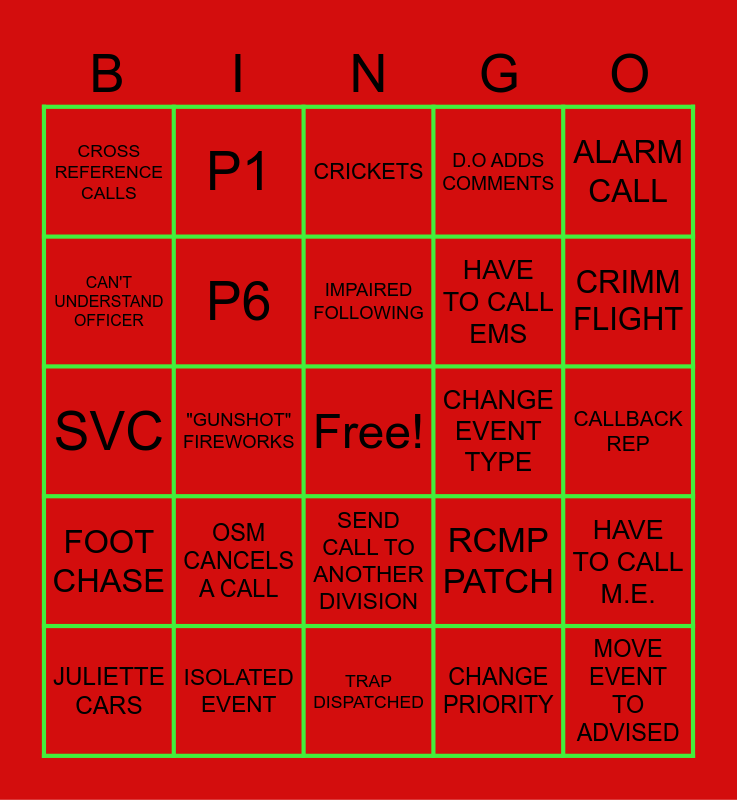 This bingo card has a free space and 24 words: OSM CANCELS A CALL, ISOLATED EVENT, IMPAIRED FOLLOWING, JULIETTE CARS, ALARM CALL, CROSS REFERENCE CALLS, CAN'T UNDERSTAND OFFICER, P1, CHANGE EVENT TYPE, SEND CALL TO ANOTHER DIVISION, HAVE TO CALL EMS, SVC, RCMP PATCH, HAVE TO CALL M.E., P6, CHANGE PRIORITY, CALLBACK REP, CRICKETS, CRIMM FLIGHT, "GUNSHOT" FIREWORKS, MOVE EVENT TO ADVISED, FOOT CHASE, D.O ADDS COMMENTS and TRAP DISPATCHED.