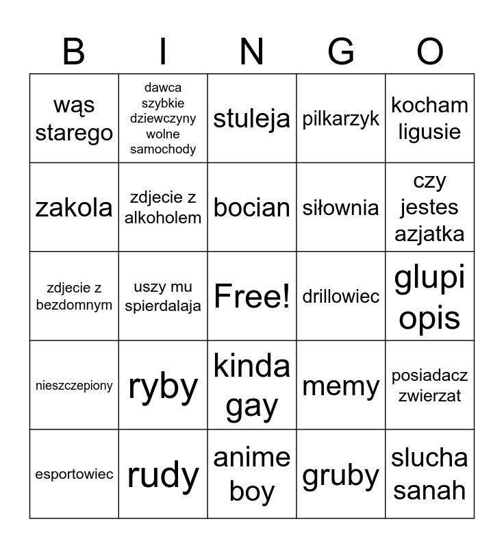 This bingo card has a free space and 24 words: ryby, rudy, bocian, esportowiec, kocham ligusie, wąs starego, zakola, dawca szybkie dziewczyny wolne samochody, drillowiec, kinda gay, siłownia, zdjecie z bezdomnym, memy, posiadacz zwierzat, zdjecie z alkoholem, gruby, glupi opis, stuleja, czy jestes azjatka, uszy mu spierdalaja, slucha sanah, nieszczepiony, pilkarzyk and anime boy.
