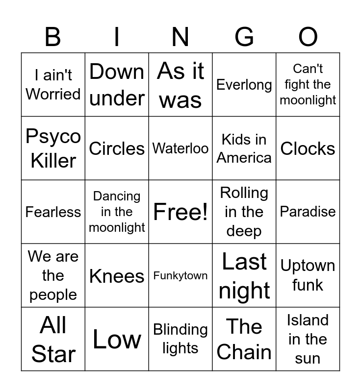 This bingo card has a free space and 54 words: Karma, Knees, Viva La Vida, Confidence, Paradise, Anti-hero, Circles, Kryptonite, Everlong, Locked out of heaven, I ain't Worried, Go your own way, The Chain, Uptown funk, Hello, Crocodile rock, Waterloo, Kids in America, Fast Car, All Star, Low, Blinding lights, Rolling in the deep, Can't fight the moonlight, Scar, Down under, Funkytown, Eagle Rock, Saving up, Prada, Downtown, The Gambler, Black Betty, Free Fallin, Psyco Killer, Everywhere, As it was, Last night, Island in the sun, Fearless, Bones, Dance the night, i gotta feeling, Heat waves, Shivers, How to save a life, Torn, Better days, Clocks, We are the people, Dancing in the moonlight, Chasing cars, Africa and Uptown girl.