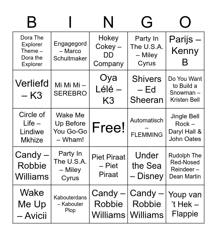 This bingo card has a free space and 75 words: Toeter Op M’n Waterscooter – Gebroeders Ko, Shut Up and Dance – WALK THE MOON, Hokey Cokey – DD Company, Wake Me Up – Avicii, Macarena – Los Del Rio, Vluchtstrook – Kris Kross Amsterdam, I'm good – David Guetta, Driving Home for Christmas – Chris Rea, Het Vliegerlied – Cafe the Block, Last Friday Night – Katy Perry, Goeiemorge zonneschijn – De Wannebiezz, Thriller – Michael Jackson, Oya Lélé – K3, Verliefd – K3, Shut Up and Dance – WALK THE MOON, Wake Me Up Before You Go-Go – Wham!, Dynamite – Taio Cruz, Youp van ’t Hek – Flappie, Candy – Robbie Williams, Parijs – Kenny B, Goeiemorge zonneschijn – De Wannebiezz, Circle of Life – Lindiwe Mkhize, Mi Mi Mi – SEREBRO, Engagegord – Marco Schuitmaker, Party In The U.S.A. – Miley Cyrus, Op Een Onbewoond Eiland – Kinderen voor Kinderen, Engagegord – Marco Schuitmaker, I Gotta Feeling – Black Eyed Peas, Candy – Robbie Williams, Het is een Nacht - Guus Meeuwis, Wake Me Up Before You Go-Go – Wham!, Highwire – AC/DC, Flappie – Youp van ’t Hek, Under the Sea – Disney, Do You Want to Build a Snowman – Kristen Bell, Shivers – Ed Sheeran, Feliz Navidad – José Feliciano, Multicolor – Son Mieux, Jingle Bell Rock – Daryl Hall & John Oates, Candy – Robbie Williams, Shake Up Christmas – Train, As It Was – Harry Styles, I'm good – David Guetta, Thriller – Michael Jackson, Verliefd – K3, Shut Up and Dance – WALK THE MOON, Wake Me Up – Avicii, Dora The Explorer Theme – Dora the Explorer, Beauty & De Brains – Nielson, Noodgeval – Goldband, Counting Stars – OneRepublic, Piet Piraat – Piet Piraat, Candy – Robbie Williams, Candy – Robbie Williams, Beauty & De Brains – Nielson, Wake Me Up – Avicii, Goeiemorge zonneschijn – De Wannebiezz, Last Christmas – Wham!, Rainbow In The Sky – Paul Elstak, Het Vliegerlied – Cafe the Block, Party In The U.S.A. – Miley Cyrus, Candy – Robbie Williams, Counting Stars – OneRepublic, You’ve Got a Friend in Me – Randy Newman, Candy – Robbie Williams, Automatisch – FLEMMING, Candy – Robbie Williams, Candy – Robbie Williams, Do You Want to Build a Snowman – Kristen Bell, Rudolph The Red-Nosed Reindeer – Dean Martin, Candy – Robbie Williams, Kabouterdans – Kabouter Plop, Mamma Mia – ABBA, Candy – Robbie Williams and I Gotta Feeling – Black Eyed Peas.
