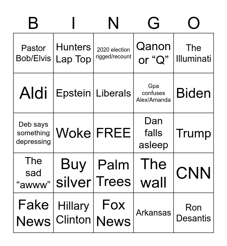 This bingo card has a free space and 24 words: Fake News, Buy silver, Liberals, Arkansas, The Illuminati, Pastor Bob/Elvis, Hunters Lap Top, 2020 election rigged/recount, Dan falls asleep, Trump, Deb says something depressing, Epstein, The wall, CNN, Aldi, Hillary Clinton, Fox News, Qanon or “Q”, Biden, The sad “awww”, Woke, Palm Trees, Gpa confuses Alex/Amanda and Ron Desantis.