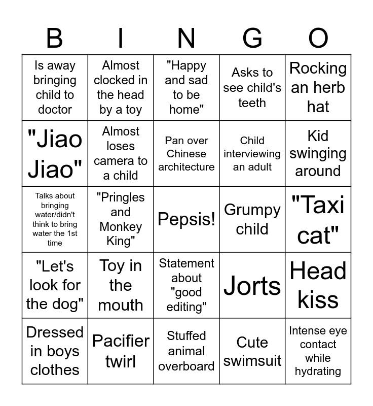 This bingo card has a free space and 24 words: Toy in the mouth, Pacifier twirl, Pan over Chinese architecture, Dressed in boys clothes, Rocking an herb hat, Is away bringing child to doctor, "Jiao Jiao", Almost clocked in the head by a toy, Grumpy child, Statement about "good editing", Child interviewing an adult, Talks about bringing water/didn't think to bring water the 1st time, Jorts, Head kiss, Almost loses camera to a child, Cute swimsuit, "Taxi cat", "Happy and sad to be home", Kid swinging around, "Pringles and Monkey King", Intense eye contact while hydrating, "Let's look for the dog", Asks to see child's teeth and Stuffed animal overboard.