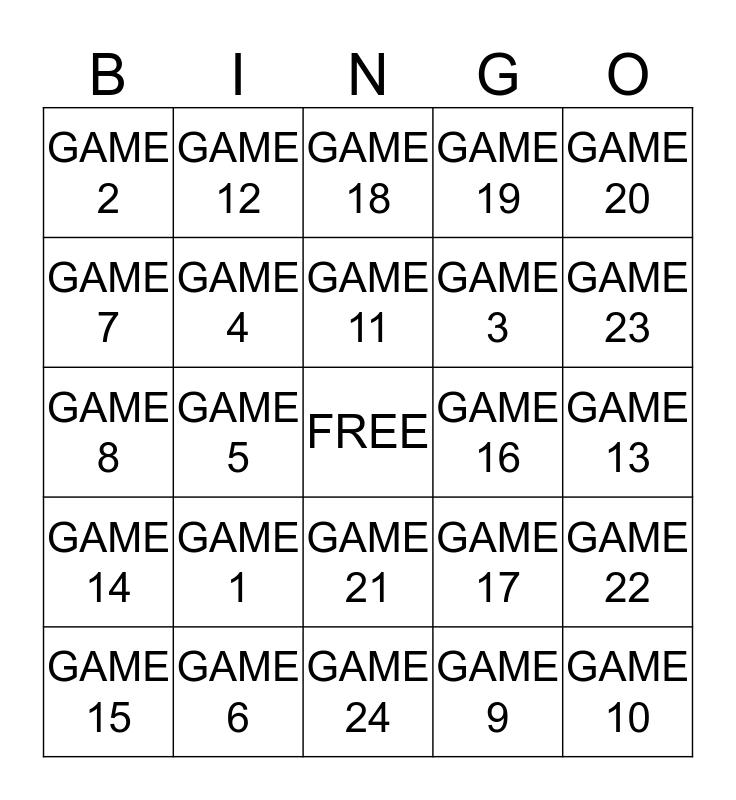 This bingo card has a free space and 24 words: GAME 1, GAME 6, GAME 11, GAME 15, GAME 20, GAME 2, GAME 7, GAME 12, GAME 16, GAME 21, GAME 3, GAME 8, GAME 17, GAME 22, GAME 4, GAME 9, GAME 13, GAME 18, GAME 23, GAME 5, GAME 10, GAME 14, GAME 19 and GAME 24.