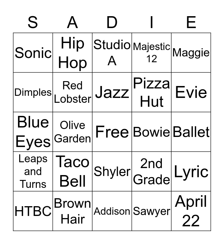 This bingo card has a free space and 24 words: Taco Bell, Brown Hair, Jazz, HTBC, Maggie, Sonic, Dimples, Hip Hop, Bowie, Shyler, Pizza Hut, Blue Eyes, 2nd Grade, Lyric, Red Lobster, Sawyer, Ballet, Studio A, Evie, Olive Garden, April 22, Leaps and Turns, Majestic 12 and Addison.