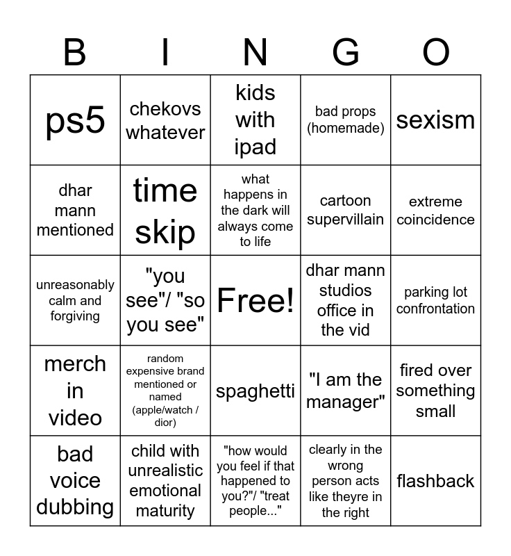 This bingo card has a free space and 39 words: Somone is fired over something small, oblivious parent w/ demon child, creep behavior, time skip, bad voice dubbing, spaghetti, what happens in the dark will always come to life, dhar mann voiceover, sexism, merch in video, "you see"/ "so you see", bad props (homemade), flashback, parking lot confrontation, dhar mann studios office in the vid, random expensive brand mentioned or named (apple/watch / dior), dhar car, ps5, kids with ipad, "I am the manager", dhar mann mentioned, "how would you feel if that happened to you?"/ "treat people...", cartoon supervillain, extreme coincidence, continuity error, flashback, bad props (homemade), dhar mann voiceover, unreasonable mom, chill dad, chekovs whatever, using a famous quote unattributable to anyone, extreme coincidence, kids with ipad, child with unrealistic emotional maturity, clearly in the wrong person acts like theyre in the right, random dramatic/emotional monologue, fired over something small, unreasonably calm and forgiving and credit card declined.