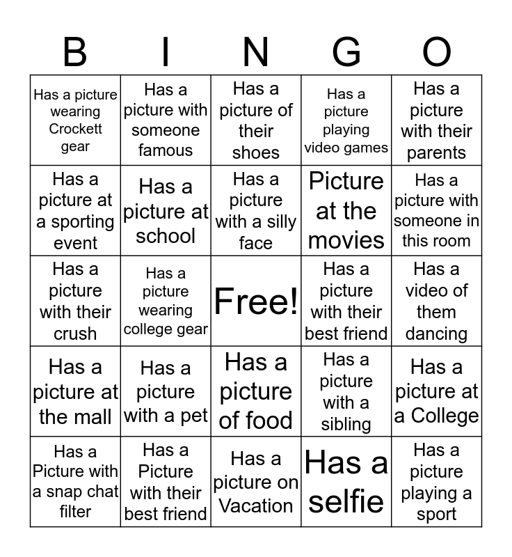 This bingo card has a free space and 24 words: Has a picture with a pet, Has a Picture with their best friend, Has a picture with a silly face, Has a Picture with a snap chat filter, Has a picture with their parents, Has a picture wearing Crockett gear, Has a picture at a sporting event, Has a picture with someone famous, Has a picture with their best friend, Has a picture of food, Picture at the movies, Has a picture with their crush, Has a picture with a sibling, Has a picture at a College, Has a picture at school, Has a selfie, Has a video of them dancing, Has a picture of their shoes, Has a picture with someone in this room, Has a picture wearing college gear, Has a picture playing a sport, Has a picture at the mall, Has a picture playing video games and Has a picture on Vacation.