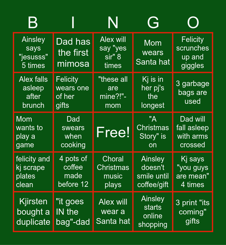 This bingo card has a free space and 24 words: 4 pots of coffee made before 12, "it goes IN the bag"-dad, "these all are mine?!"- mom, Kjirsten bought a duplicate, Felicity scrunches up and giggles, Ainsley says "jesusss" 5 times, Alex falls asleep after brunch, Dad has the first mimosa, "A Christmas Story" is on, Choral Christmas music plays, Kj is in her pj's the longest, Mom wants to play a game, Ainsley doesn't smile until coffee/gift, Kj says "you guys are mean" 4 times, Felicity wears one of her gifts, Ainsley starts online shopping, Dad will fall asleep with arms crossed, Alex will say "yes sir" 8 times, 3 garbage bags are used, Dad swears when cooking, 3 print "its coming" gifts, felicity and kj scrape plates clean, Mom wears Santa hat and Alex will wear a Santa hat.
