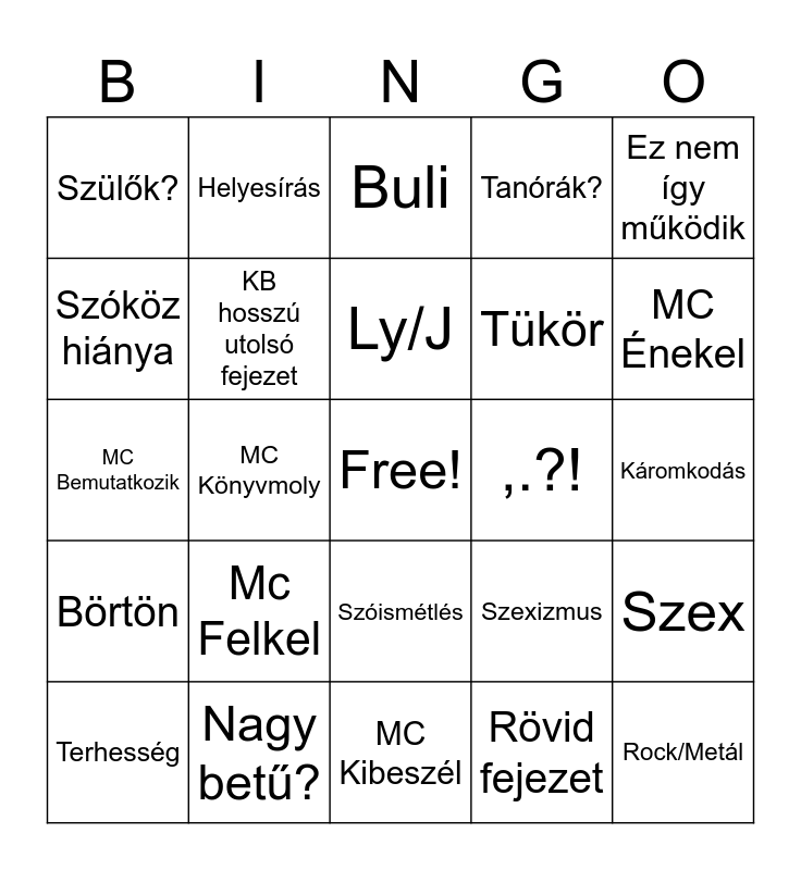 This bingo card has a free space and 24 words: Mc Felkel, Nagy betű?, Ly/J, Terhesség, Ez nem így működik, Szülők?, Szóköz hiánya, Helyesírás, ,.?!, Szóismétlés, Tükör, MC Bemutatkozik, Szexizmus, Szex, KB hosszú utolsó fejezet, Rövid fejezet, Káromkodás, Buli, MC Énekel, MC Könyvmoly, Rock/Metál, Börtön, Tanórák? and MC Kibeszél.