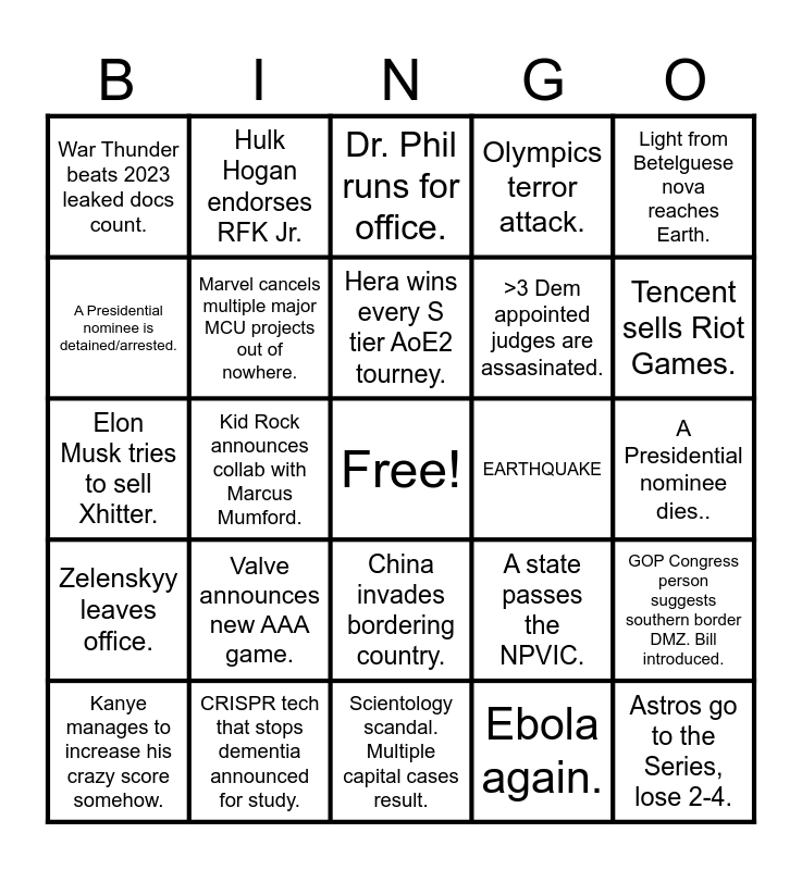 This bingo card has a free space and 24 words: Valve announces new AAA game., CRISPR tech that stops dementia announced for study., Hera wins every S tier AoE2 tourney., Kanye manages to increase his crazy score somehow., Light from Betelguese nova reaches Earth., War Thunder beats 2023 leaked docs count., A Presidential nominee is detained/arrested., Hulk Hogan endorses RFK Jr., EARTHQUAKE, China invades bordering country., >3 Dem appointed judges are assasinated., Elon Musk tries to sell Xhitter., A state passes the NPVIC., GOP Congress person suggests southern border DMZ. Bill introduced., Marvel cancels multiple major MCU projects out of nowhere., Ebola again., A Presidential nominee dies.., Dr. Phil runs for office., Tencent sells Riot Games., Kid Rock announces collab with Marcus Mumford., Astros go to the Series, lose 2-4., Zelenskyy leaves office., Olympics terror attack. and Scientology scandal. Multiple capital cases result..