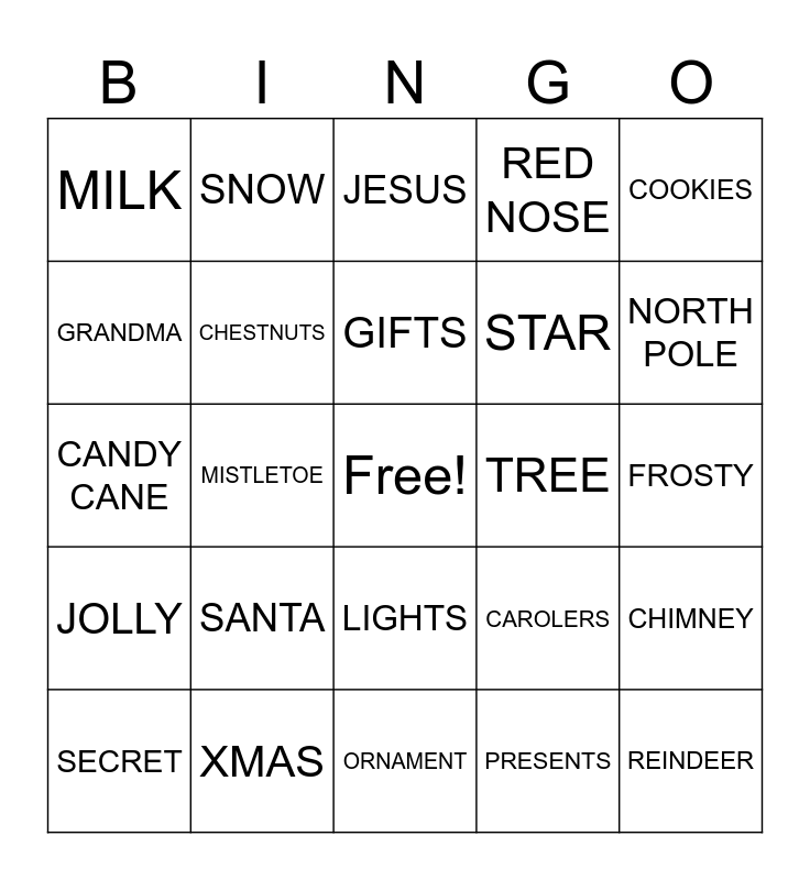 This bingo card has a free space and 25 words: SANTA, ORNAMENT, GIFTS, SECRET, COOKIES, MILK, GRANDMA, SNOW, TREE, LIGHTS, STAR, CANDY CANE, CAROLERS, CHIMNEY, CHESTNUTS, ELF, FROSTY, JESUS, NORTH POLE, MISTLETOE, REINDEER, XMAS, JOLLY, RED NOSE and PRESENTS.