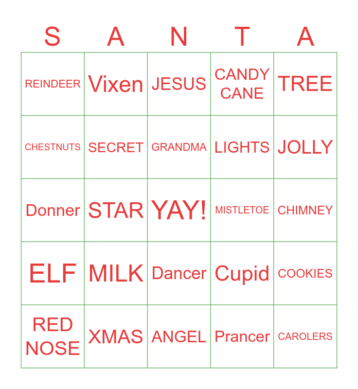 This bingo card has a free space and 38 words: SANTA, ORNAMENT, GIFTS, SECRET, COOKIES, MILK, GRANDMA, SNOW, TREE, LIGHTS, STAR, CANDY CANE, CAROLERS, CHIMNEY, CHESTNUTS, ELF, FROSTY, JESUS, NORTH POLE, MISTLETOE, REINDEER, XMAS, JOLLY, RED NOSE, PRESENTS, ANGEL, SLEIGH, JACK FROST, TINSEL, RUDOLPH, Dasher, Dancer, Prancer, Vixen, Comet, Cupid, Donner and Blitzen.
