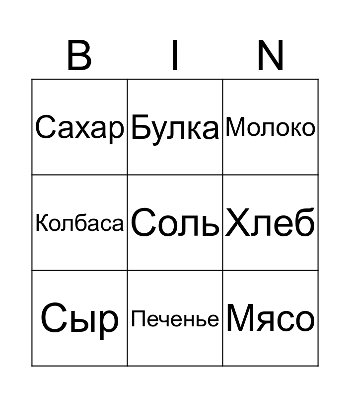 This bingo card has a free space and 8 words: Хлеб, Молоко, Булка, Сыр, Сахар, Мясо, Колбаса and Печенье.