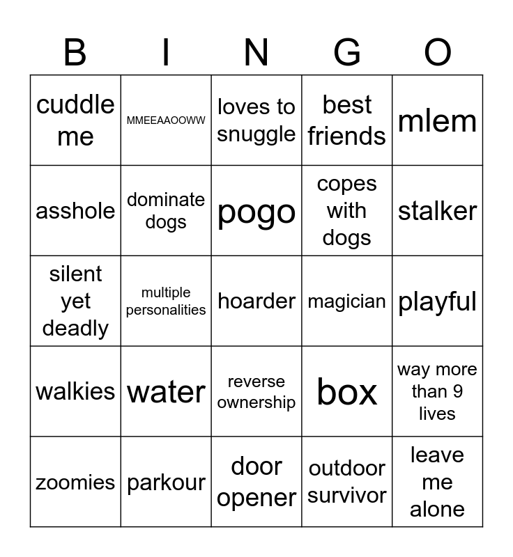 This bingo card has a free space and 24 words: water, parkour, pogo, zoomies, mlem, cuddle me, asshole, MMEEAAOOWW, magician, reverse ownership, copes with dogs, silent yet deadly, box, way more than 9 lives, dominate dogs, outdoor survivor, playful, loves to snuggle, stalker, multiple personalities, leave me alone, walkies, best friends and door opener.