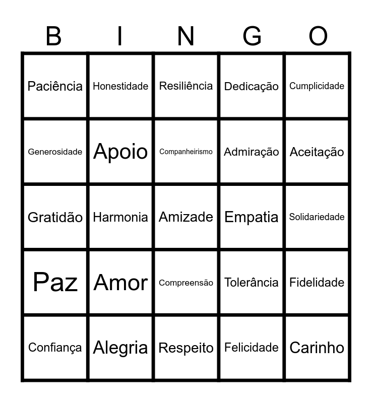 This bingo card has 25 words: Amor, Respeito, Companheirismo, Confiança, Cumplicidade, Paciência, Generosidade, Honestidade, Empatia, Compreensão, Admiração, Gratidão, Tolerância, Fidelidade, Apoio, Carinho, Solidariedade, Resiliência, Aceitação, Harmonia, Amizade, Alegria, Paz, Dedicação and Felicidade.