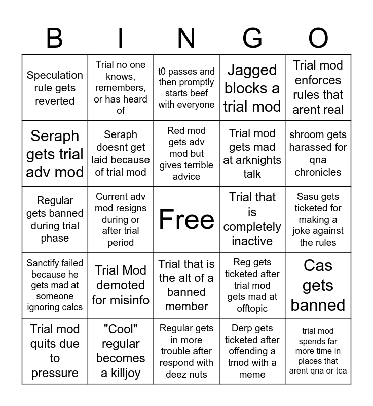 This bingo card has a free space and 24 words: Trial Mod demoted for misinfo, "Cool" regular becomes a killjoy, Red mod gets adv mod but gives terrible advice, Trial mod quits due to pressure, Trial mod enforces rules that arent real, Speculation rule gets reverted, Seraph gets trial adv mod, Trial no one knows, remembers, or has heard of, Trial that is completely inactive, Trial that is the alt of a banned member, Trial mod gets mad at arknights talk, Regular gets banned during trial phase, Reg gets ticketed after trial mod gets mad at offtopic, Cas gets banned, Seraph doesnt get laid because of trial mod, Derp gets ticketed after offending a tmod with a meme, Sasu gets ticketed for making a joke against the rules, t0 passes and then promptly starts beef with everyone, shroom gets harassed for qna chronicles, Current adv mod resigns during or after trial period, trial mod spends far more time in places that arent qna or tca, Sanctify failed because he gets mad at someone ignoring calcs, Jagged blocks a trial mod and Regular gets in more trouble after respond with deez nuts.