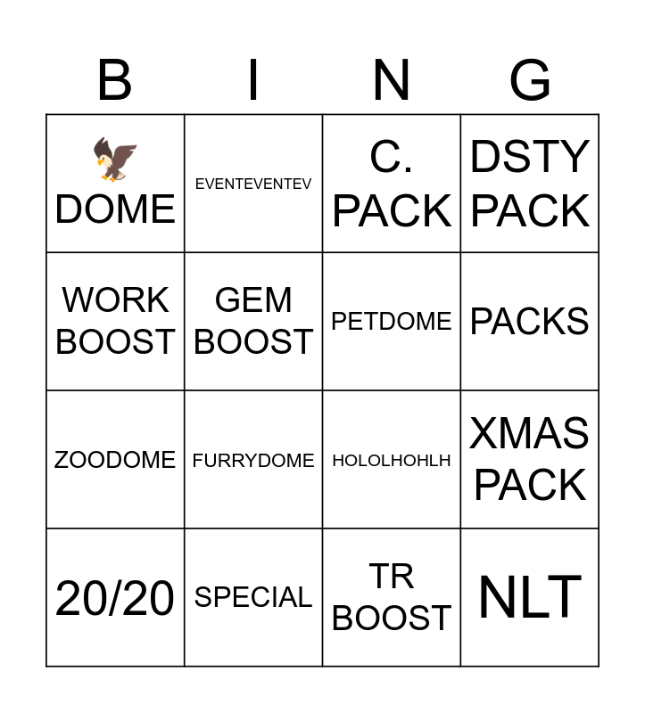 This bingo card has 16 words: SPECIAL, XMAS PACK, C. PACK, 🦅DOME, ZOODOME, EVENTEVENTEV, HOLOLHOHLH, TR BOOST, WORK BOOST, GEM BOOST, 20/20, DSTY PACK, FURRYDOME, PACKS, PETDOME and NLT.