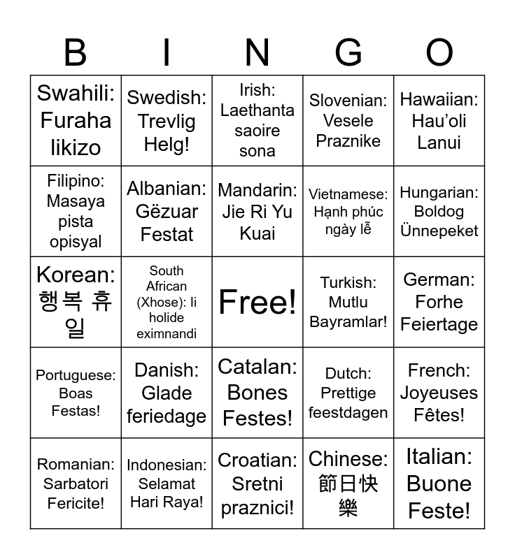 This bingo card has a free space and 28 words: French: Joyeuses Fêtes!, Spanish: Felices Fiestas!, Vietnamese: Hạnh phúc ngày lễ, Chinese: 節日快樂, Filipino: Masaya pista opisyal, Irish: Laethanta saoire sona, Swedish: Trevlig Helg!, Portuguese: Boas Festas!, Turkish: Mutlu Bayramlar!, Romanian: Sarbatori Fericite!, Korean: 행복 휴일, Slovenian: Vesele Praznike, Indonesian: Selamat Hari Raya!, Croatian: Sretni praznici!, Hungarian: Boldog Ünnepeket, Greek: Καλές δικακοπές! (kales diakopes), Danish: Glade feriedage, Albanian: Gëzuar Festat, Mandarin: Jie Ri Yu Kuai, Catalan: Bones Festes!, Swahili: Furaha likizo, Japanese: 幸せな休日, Italian: Buone Feste!, South African (Xhose): Ii holide eximnandi, German: Forhe Feiertage, Dutch: Prettige feestdagen, Hawaiian: Hau’oli Lanui and Hebrew: חג שמח.