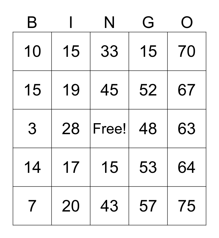 This bingo card has a free space and 29 words: 1, 20, 33, 60, 70, 10, 19, 45, 48, 64, 7, 28, 57, 75, 3, 26, 43, 53, 67, 14, 17, 32, 52, 63, 15, 15, 15, 15 and 15.