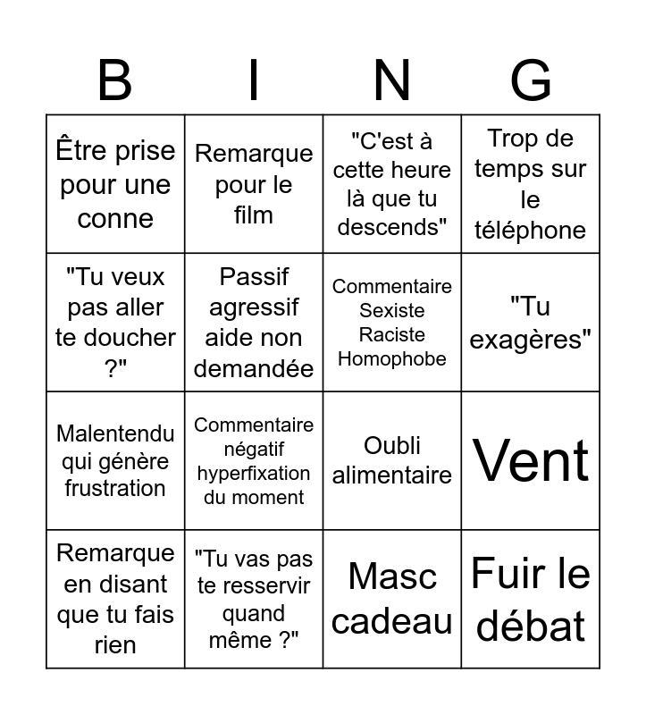 This bingo card has 16 words: Remarque en disant que tu fais rien, "Tu vas pas te resservir quand même ?", "C'est à cette heure là que tu descends", Trop de temps sur le téléphone, "Tu veux pas aller te doucher ?", Remarque pour le film, Oubli alimentaire, Vent, Être prise pour une conne, Passif agressif aide non demandée, Masc cadeau, "Tu exagères", Malentendu qui génère frustration, Commentaire négatif hyperfixation du moment, Commentaire Sexiste Raciste Homophobe and Fuir le débat.