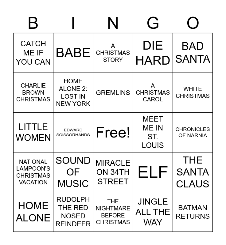 This bingo card has a free space and 29 words: HOME ALONE, THE GRINCH, EDWARD SCISSORHANDS, LOVE ACTUALLY, CATCH ME IF YOU CAN, A CHRISTMAS STORY, HOME ALONE 2: LOST IN NEW YORK, SOUND OF MUSIC, MEET ME IN ST. LOUIS, RUDOLPH THE RED NOSED REINDEER, CHRONICLES OF NARNIA, BATMAN RETURNS, THE NIGHTMARE BEFORE CHRISTMAS, JINGLE ALL THE WAY, WHITE CHRISTMAS, FROSTY THE SNOWMAN, MIRACLE ON 34TH STREET, NATIONAL LAMPOON'S CHRISTMAS VACATION, BAD SANTA, LITTLE WOMEN, ELF, TRADING PLACES, A CHRISTMAS CAROL, CHARLIE BROWN CHRISTMAS, DIE HARD, BABE, THE SANTA CLAUS, GREMLINS and IT'S A WONDERFUL LIFE.