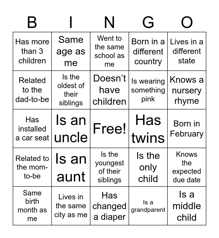 This bingo card has a free space and 24 words: Is an aunt, Lives in the same city as me, Doesn’t have children, Same birth month as me, Lives in a different state, Has more than 3 children, Related to the dad-to-be, Same age as me, Has twins, Is the youngest of their siblings, Is wearing something pink, Has installed a car seat, Is the only child, Knows the expected due date, Is the oldest of their siblings, Is a grandparent, Born in February, Went to the same school as me, Knows a nursery rhyme, Is an uncle, Is a middle child, Related to the mom-to-be, Born in a different country and Has changed a diaper.