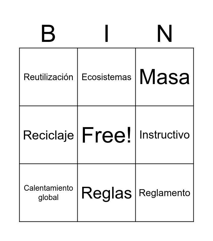 This bingo card has a free space and 11 words: Medición, Reglas, Reglamento, Calentamiento global, Ecosistemas, Masa, Instructivo, Kilogramo, Reciclaje, Reutilización and Unidades de medida.