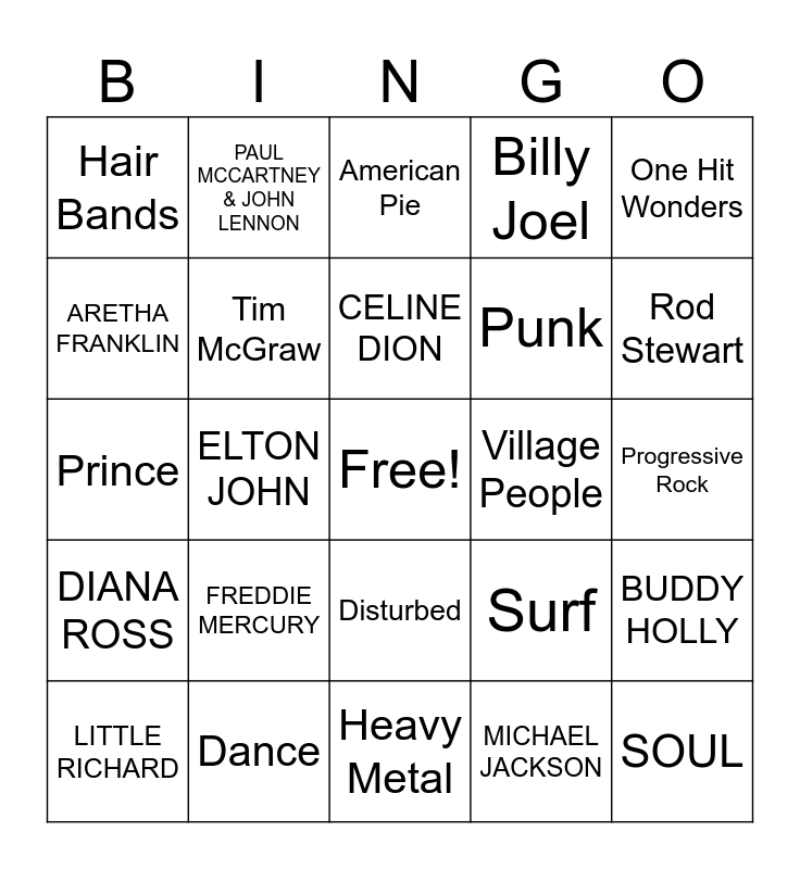 This bingo card has a free space and 49 words: ABBA, ELVIS PRESLEY, Grunge, MICHAEL JACKSON, Progressive Rock, Pop, PAUL MCCARTNEY & JOHN LENNON, Soul, Punk, Woodstock, ARETHA FRANKLIN, ELTON JOHN, Surf, SOUL, Muddy Waters, Motown, American Pie, Village People, Bill Haley & the Comets, Hair Bands, Dance, Heavy Metal, Billy Joel, One Hit Wonders, NIRVANA, FREDDIE MERCURY, CELINE DION, JAMES BROWN, BUDDY HOLLY, DIANA ROSS, RAY CHARLES, Disturbed, Blink 182, Earth Wind & Fire, LITTLE RICHARD, Hooty & the Blowfish, Aerosmith, Maneskin, Rod Stewart, Poison, Lynard Skynard, Rolling Stones, Jackson 5, Elvis Costello, Prince, Tim McGraw, Bruno Mars, David Bowie and Rage Against the Machine.
