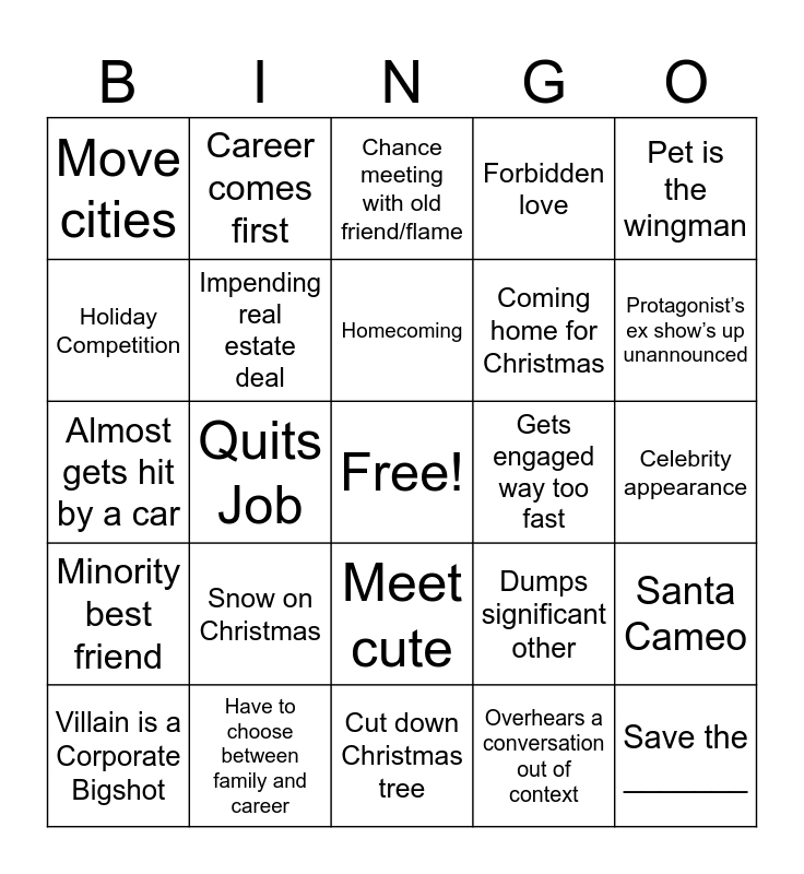 This bingo card has a free space and 65 words: The wrong love interest wins, Cheating on partner, Big city girl/boy, Santa Cameo, Magic/Supernatural events, Hallmark merchandise, Career comes first, Terrible pun, Homecoming, A prince or princess, Meet cute, Someone is injured, Celebrity appearance, Pet is the wingman, Main character is an artist, Holiday Competition, Quits Job, Move cities, Dead parent, Coming home for Christmas, Snow on Christmas, Minority best friend, Forbidden love, Hates Christmas/ No Christmas Spirit, Reunited with ex-lover, Singing Christmas Songs, Christmas isn’t about presents, Small town > big city, Save the _______, Hometown Hero, Villain is a Corporate Bigshot, Best Friends to lovers, Kid is a matchmaker, Workaholic main character, Dumps significant other, Have to choose between family and career, “we’re not together”, Almost gets hit by a car, Overhears a conversation out of context, Mistletoe, Impending real estate deal, He loves animals, Gets engaged way too fast, Regular Proposal, Coffee/tea date, Holiday showcase, Protagonist’s ex show’s up unannounced, Awkward first encounter, Enemies to lovers, Memory loss, Forced to stay with the love interest, Cancelled flight, Lost item returned, Cut down Christmas tree, Someone makes a wish, Male lead drives a truck, Gift wrapping scene, Chance meeting with old friend/flame, Man saves woman from predicament, Car breaks down, Bad holiday party, Family secrets, Wedding, Makeover and Someone lies.