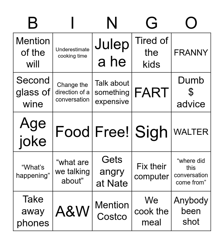 This bingo card has a free space and 38 words: Sings a Beatles song, Mention cursive writing, Complain about the direction of a conversation, Change the direction of a conversation, “where did this conversation come from”, “what are we talking about”, Talk about something expensive, Take you behind the barn, FRANNY, FART, Food, Tired of the kids, Anybody been shot, WALTER, Second glass of wine, “What’s happening”, Side convo with kids, Julep a he, ಠ_ಠ clothing, Sigh, Mention of the will, A&W, Dumb $ advice, Take away phones, Grandma on phone, Mention Costco, Glasses chest pat, Boring backstory, Bad customer service story, School, Dig at Jeff/Wes, Gets angry at Nate, We cook the meal, Underestimate cooking time, Side quest, Fix their computer, Age joke and Grandma gets upset.