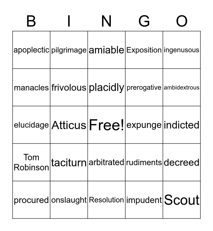 This bingo card has a free space and 24 words: taciturn, onslaught, placidly, procured, ingenusous, apoplectic, manacles, pilgrimage, expunge, arbitrated, prerogative, elucidage, rudiments, decreed, frivolous, impudent, indicted, amiable, ambidextrous, Atticus, Scout, Tom Robinson, Exposition and Resolution.