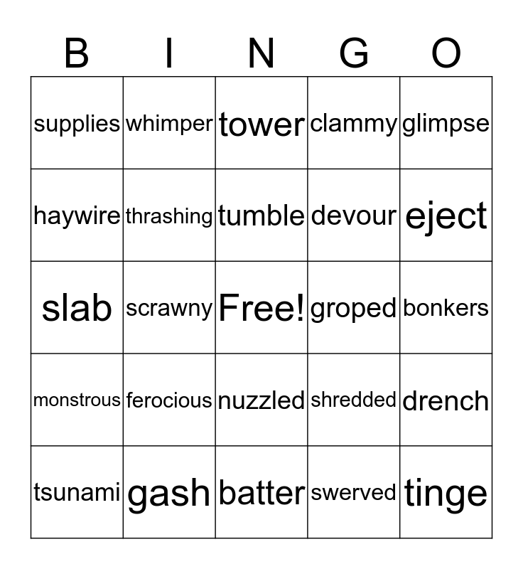 This bingo card has a free space and 24 words: ferocious, gash, tumble, tsunami, glimpse, supplies, haywire, whimper, groped, nuzzled, devour, slab, shredded, drench, thrashing, swerved, bonkers, tower, eject, scrawny, tinge, monstrous, clammy and batter.