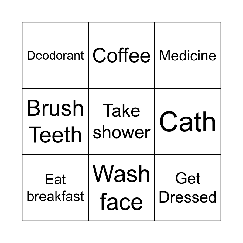 This bingo card has a free space and 8 words: Cath, Medicine, Coffee, Eat breakfast, Deodorant, Get Dressed, Brush Teeth and Wash face.
